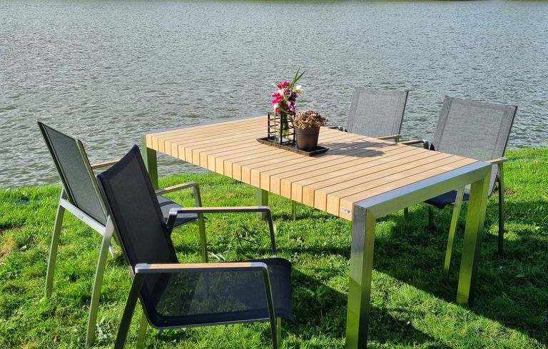 Tisch FUSION 90 x 160 cm, Teak /Edelstahl und 4 x Stapelsessel STACK, Edelstahl / orig. Batyline für € 2.300,- statt € 2.595,-